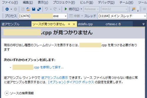 Visual Studio 2013にて、ファイルの文字コードを変更した後、デバッグ実行をしようとすると、以下のように「*.cppが見つかりません」「現在の呼び出し履歴のフレームのソースを表示するには、*.cppを見つける必要があります」というエラーが出てステップ実…