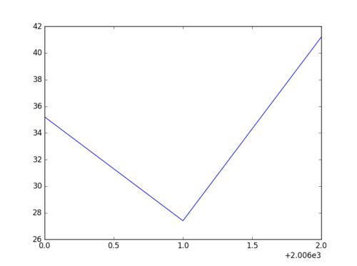問題 pythonのmatplotlibで、年ごとの値の変化を表す折れ線グラフを書こうとして以下のコードを書きました。 import numpy as np import matplotlib.pyplot as plt x = np.array([2006, 2007, 2008]) y = np.array([35.2, 27.4, 41.2]) plt.plot(x, y) plt.s…
